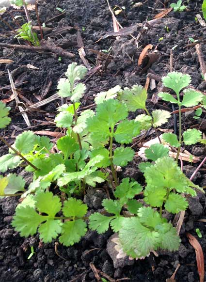 パクチーにパセリ、ルッコラ。11月。パクチーの若葉をつまんで畑で食べてみた。うん、パクチーだ!いい匂い!