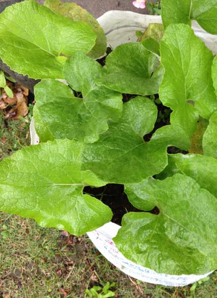 肥料袋を使ってゴボウ栽培。こうすると、収穫が楽らしい。遅まきのゴボウ。11月の様子。