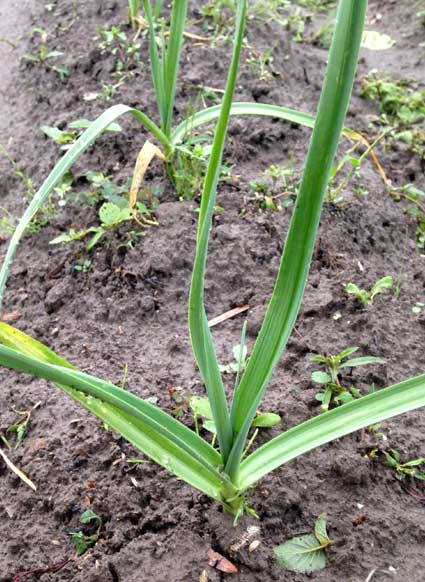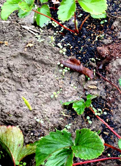 ホームセンターで種ニンニクを買って育てている11月現在の様子。右は去年親が収穫したニンニクが芽を出していたので、それを11月初旬に少し遅いかなと思いつつもイチゴの苗の近くに植えてみた。
