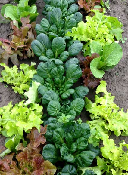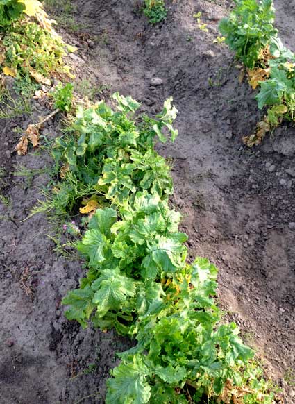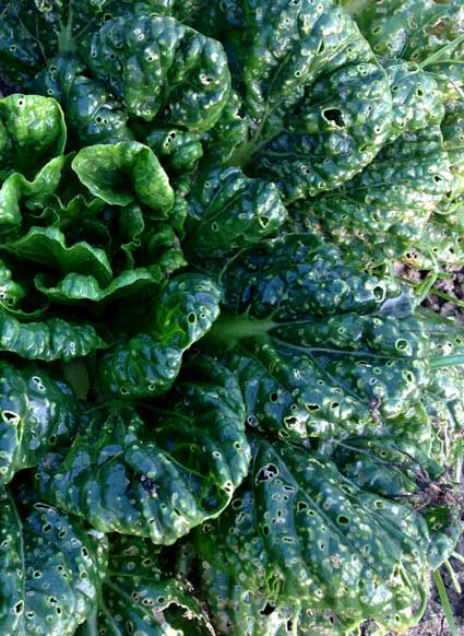 ミックスレタスとターサイ。ターサイは夏にまいたものは虫食いがひどくてうまくいかず、少し遅れて2回目にセルトレイで育てて畑に定植させたもの。ちょっと株間がせまかったな。でも苗のときに消毒をしたかいがあってか、わりと順調に育っている感じ。11月。ターサイはしっかり消毒しないと虫に穴だらけにされてしまう。右側は消毒をほとんどしなかった一回目に種まきしたもの。3枚目、大きくなって食べごろのターサイ。夏から育ててやっといい感じになった。