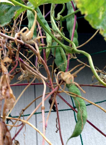 収穫期終盤のいんげん。11月。プランター植えと地植えとやったけれど、プランター植えでグリーンカーテンに這わせていたインゲンは、大きくなりすぎたものを放置してどこまで大きくなるか実験中。